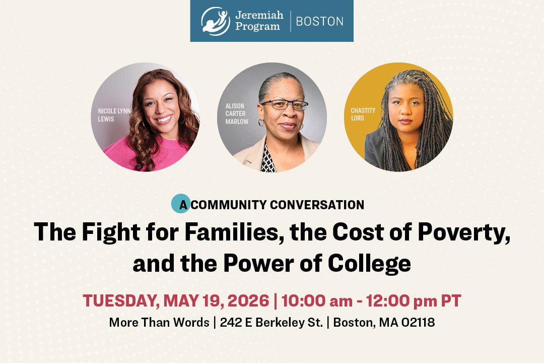 Jeremiah Program serves single moms and their children experiencing poverty in Boston, Massachusetts. Our mission is to disrupt the cycle of poverty for single mothers and their children, two generations at a time. JP believes that no mother should have to choose between investing in herself and her children.